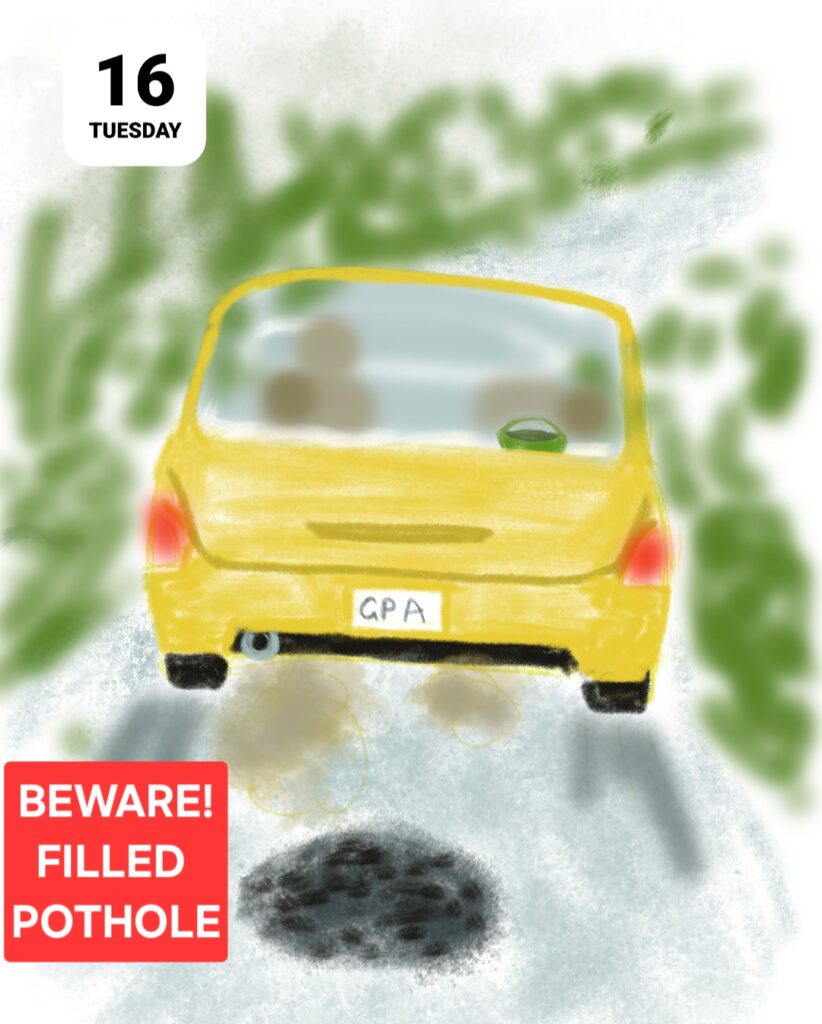 ..the yellow car had driven down the bouncy bumpy road, the workmen repaired the damage to the road. They filled the potholes with the help of the green digger.